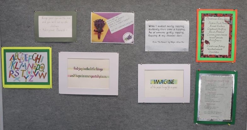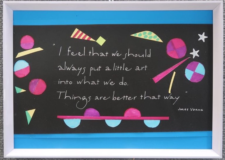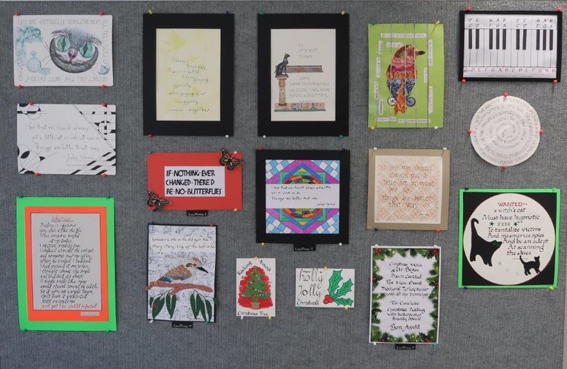 I took up Calligraphy in 2011 and first came to the Centre in 2013, to Truda Austen’s class. Last century, I was a secondary school Art teacher, interested in Art History and Design. My calligraphy passion is medieval manuscripts and illuminations. I love colour in calligraphy, and my quilting hobby is another way of playing with colour and pattern and design.