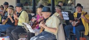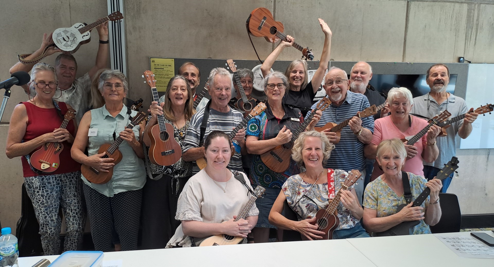 The UkeARoos always look forward to their lively Friday morning jam sessions, with lots of fun and plenty of laughter (and delicious morning teas). Pictured right are some of the men in the class, who are always in fine voice, as they lead us through one of the favourites in the songbook. Below the class in fine form all together.