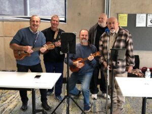 The UkeARoos always look forward to their lively Friday morning jam sessions, with lots of fun and plenty of laughter (and delicious morning teas). Pictured right are some of the men in the class, who are always in fine voice, as they lead us through one of the favourites in the songbook. Below the class in fine form all together.